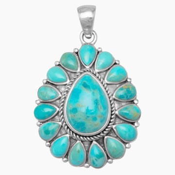 Features a centered reconstituted turquoise measuring 9mm x 13mm. Decorated with surrounding tear drop turquoise stones. The pendant measures 23mm x 37mm. .925 Sterling Silver, Oxidized.