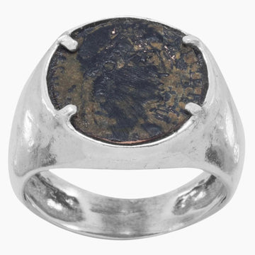 Features bronze coins dated from the 3rd and 4th century A.D. The coin measures approximately 13.5mm. The lightly hammered band tapers from 15.5mm to 4.5mm. Available in sizes 8-13. .925 Sterling Silver. Comes with certificate...