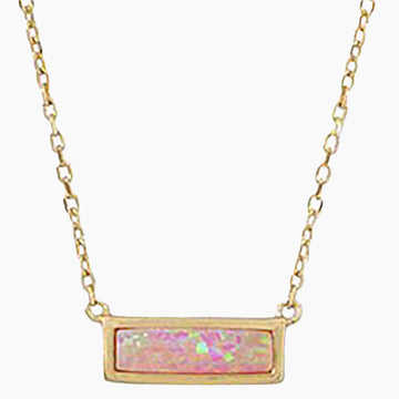 This chain measures 16" plus a 2" extension. Features a fixed synthetic pink opal bar. The opal is 10.8mm x 3mm. Finished with a lobster clasp closure. .925 Sterling Silver, 14 Karat Gold Plated.