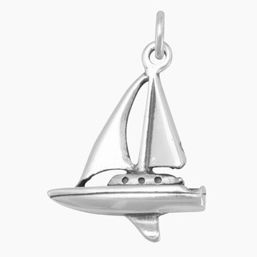 Features a 3D sailboat. The charm measures 16mm x 15mm. .925 Sterling Silver, Oxidized.