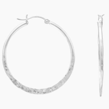 Features a hammered design on lower half. The hoops measure 35mm. French wire. .925 Sterling Silver, Polished.