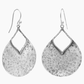 Features a hammered front design. The earrings measure 18mm. The hanging length is 30mm. French wire. .925 Sterling Silver.