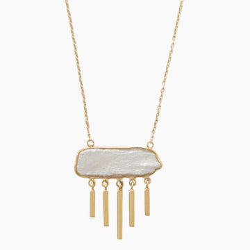 This necklace measures 16" plus a 2" extension. The stick pearl measures approximately 30mm x 8mm. The pearl will vary due to organic nature. Includes a double satellite chain drop. Finished with a lobster clasp...