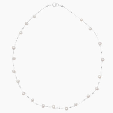 This double strand necklace measures 16". Features 5mm cultured freshwater pearls. Includes alternating silver beads Finished with a spring ring closure. .925 Sterling Silver