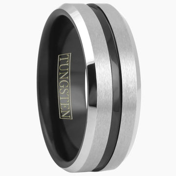 Awesome two tone tungsten ring with black recessed stripe. Finished with a brushed silver satin bevel edged finish. Slightly domed on the inside of the band for a very comfortable fit. Immediately available in sizes...