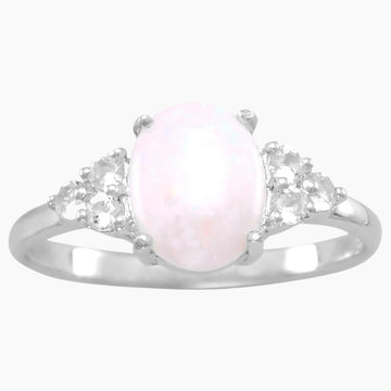 Features a genuine Australian opal measuring 7mm x 9mm. Includes white topaz on each side. The band measures 1.5mm. Available in sizes 5-10. .925 Sterling Silver, Rhodium Plated.