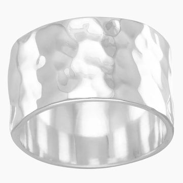 This hammered ring measures approximately 30mm on the top. Offers a snug fit. Available in sizes 6-9. .925 Sterling Silver.