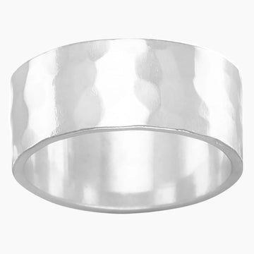This hammered band measures 8mm wide. The inside of band is engravable. Available in sizes 6-13. .925 Sterling Silver. Please contact us if interested in engraving options.