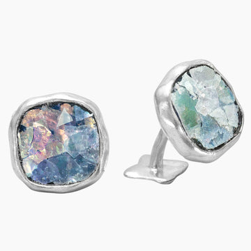 Features ancient roman glass measuring 16mm x 16mm. Includes a soft hammered silver casing. .925 Sterling Silver. Roman glass color may vary. Comes with a certificate of authenticity.